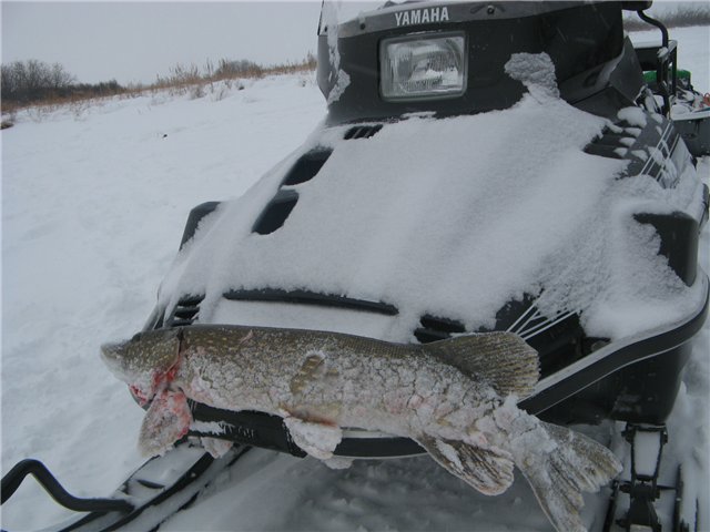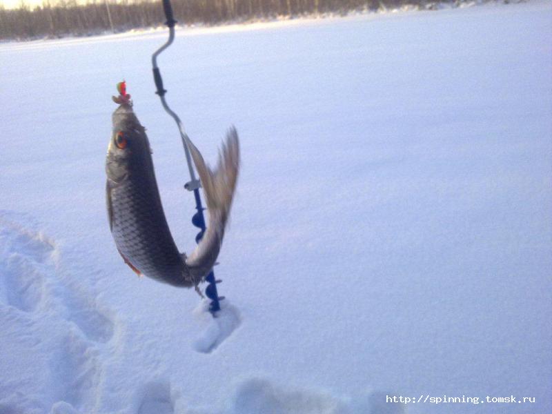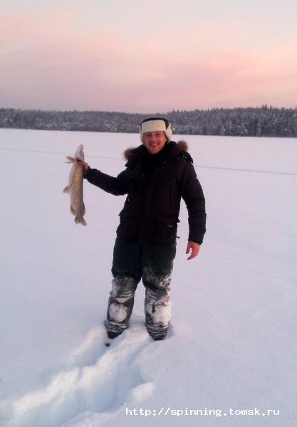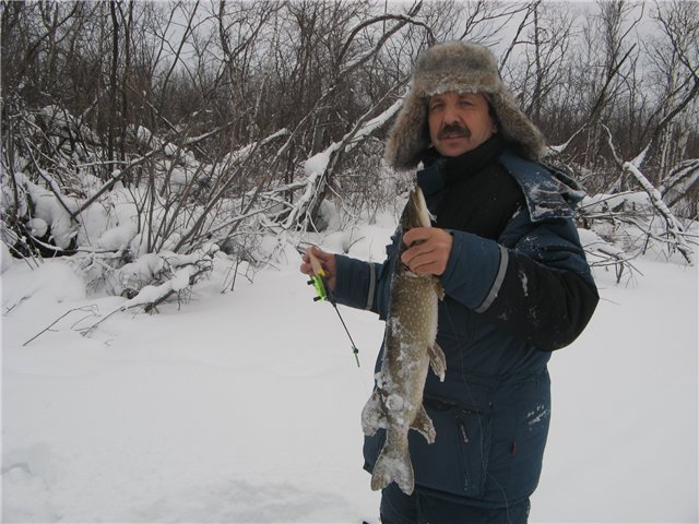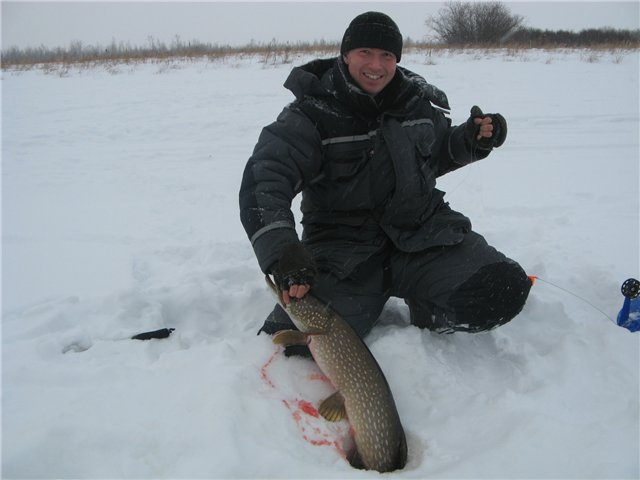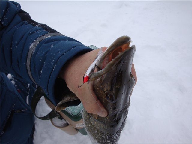 Некоторые жерлицы поставили далековато от места стоянки, поэтому приходилось периодически их обходить, флаги всё также загорались, но большинство подъёмов были из-за резвого живца. При очередном обходе подхожу к одной из жерлиц, леска смотана до конца, контрольная подсечка, начинаю выводить, а щука плывёт в моём направлении и особо не сопротивляется, как будто ничего на леске и нет кроме живца, вот уже появляется грузило и зубастая хищница наконец-то проявила свой характер, недолгое вываживание и открытая пасть щуки начинает пролезать в лунку, а из пасти неожиданно вылетает крючёк (как она не сошла до этого не пойму), как обычно богорик лежит на стане