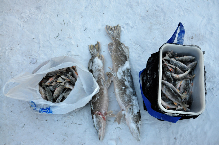 Как обычно, подъём без будильника раньше требуемого времени, похлебали вчерашней ушицы, заварили чаёк и в путь. Погода поменялась в обратную сторону и утром было около -25, не беда в палатках проживём. Приезжаем уже на знакомое место, на жерлицах горят несколько флагов, начинаем проверять, а не тут то было, леска вмёрзла по самое не хочу. В итоге провозились около 2х часов отковыриванием с помощью подручного инструмента - пешни не было(т.к. 50% лунок не хотели разбиваться ударами моего мегасапога), пошли в ход отвёртки и черпаки. Напарник добывал живца, а мы с братом занимались жерлицами. Дошли почти до конца и тут...! неси багор!, кричит напарник недалеко от нашего стана. Подбегаем!