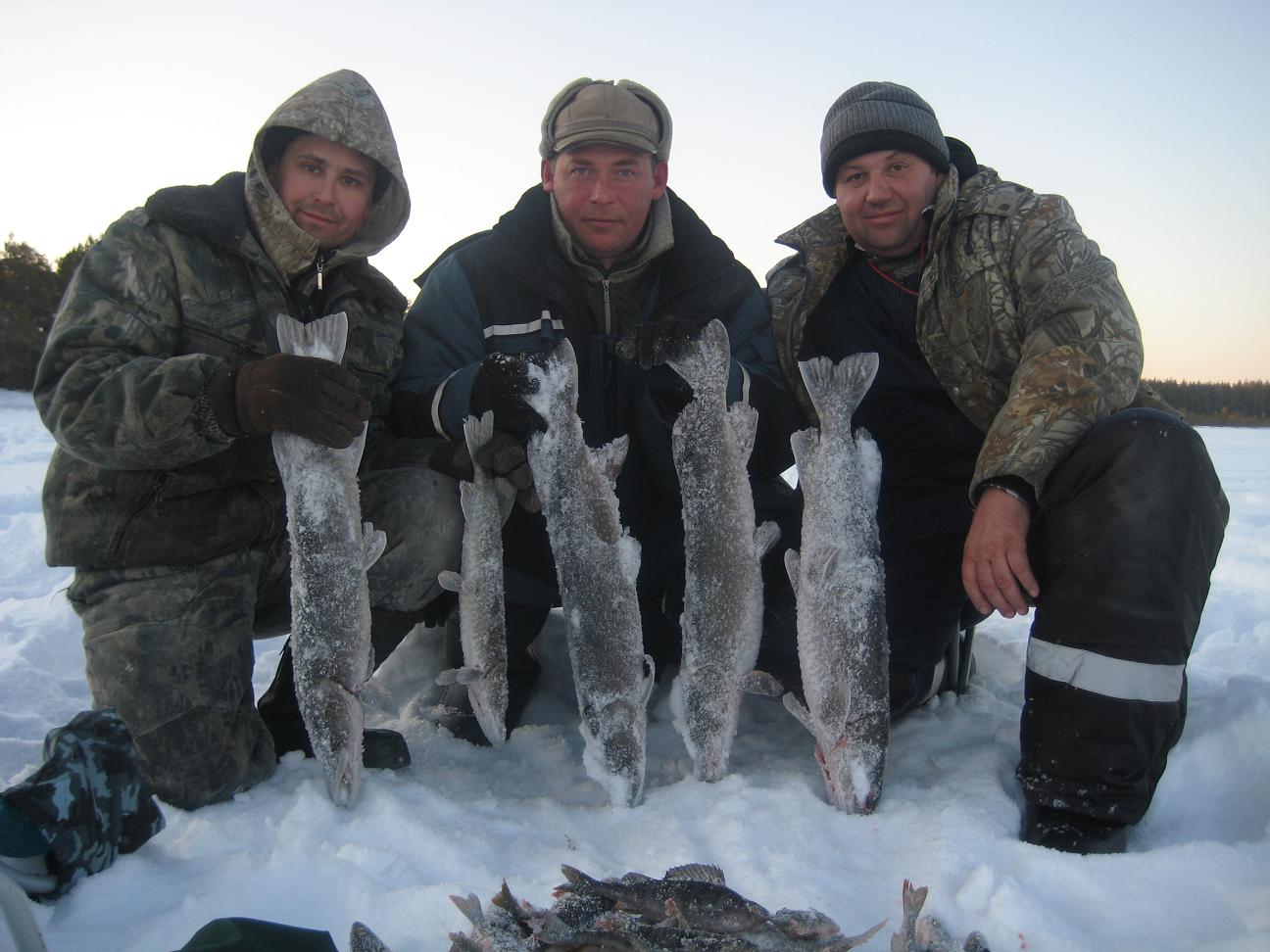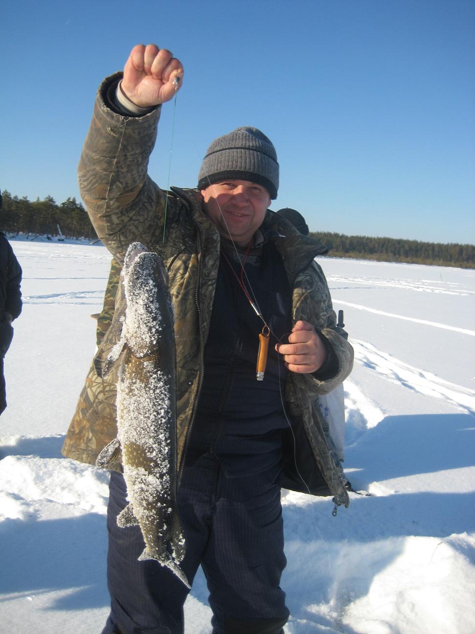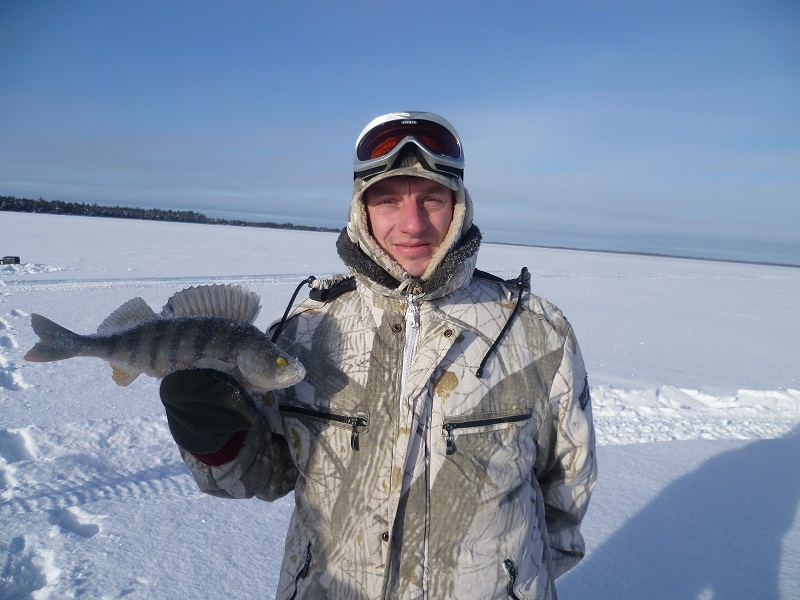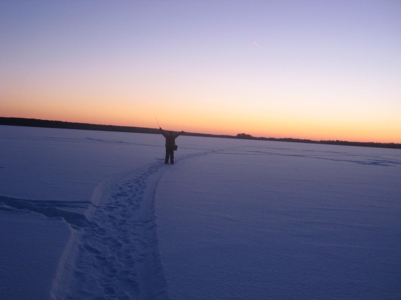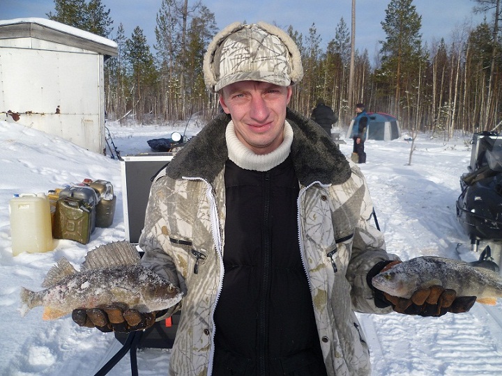 больше поклевок в этот день было. Вернулись в избушку, плотно покушали и спать. С утра еще потемну в то же место выехали. Еще в сумерках у Алексея на айсджерк взял приличный судачек.