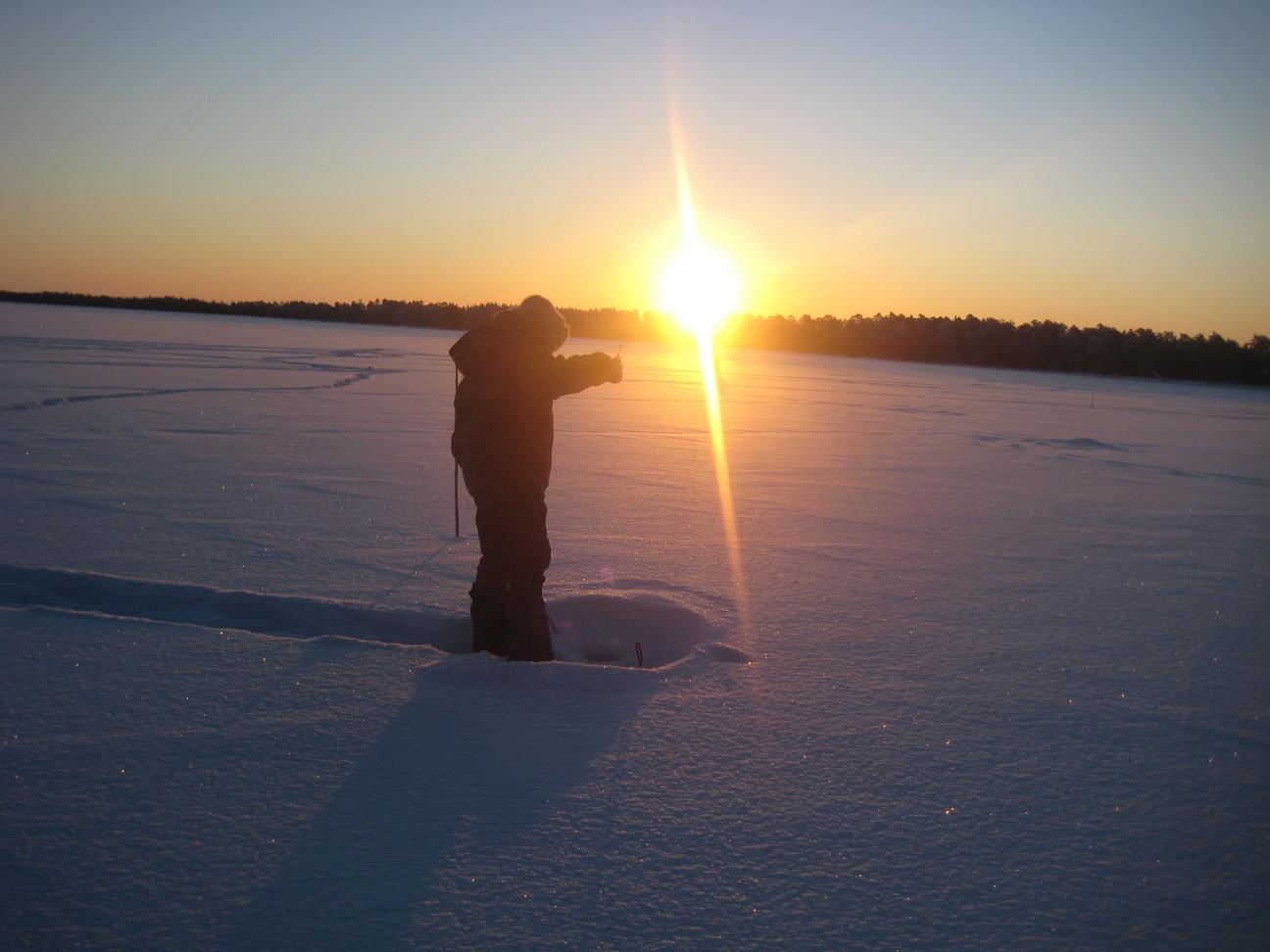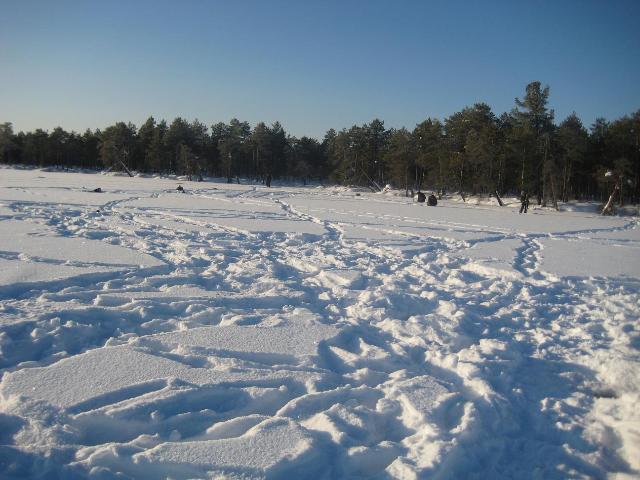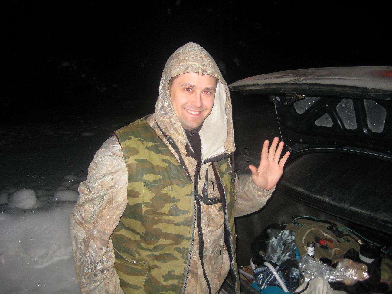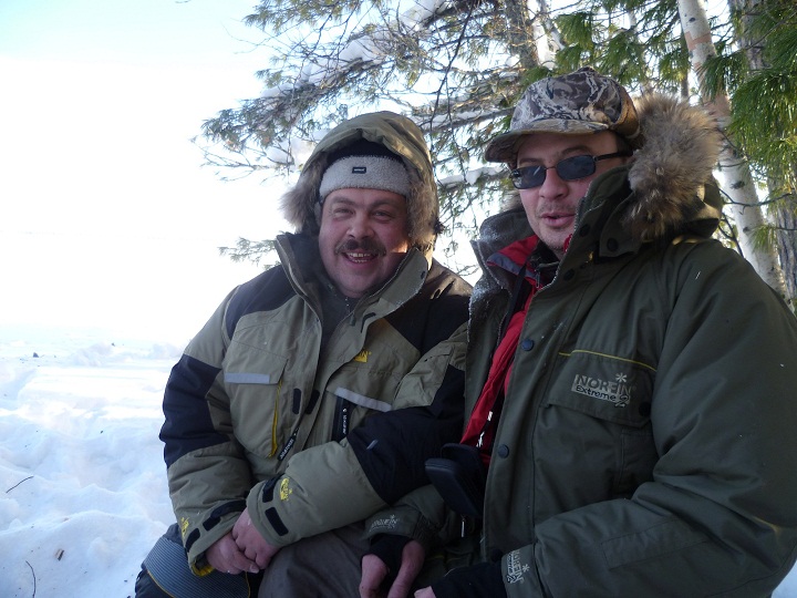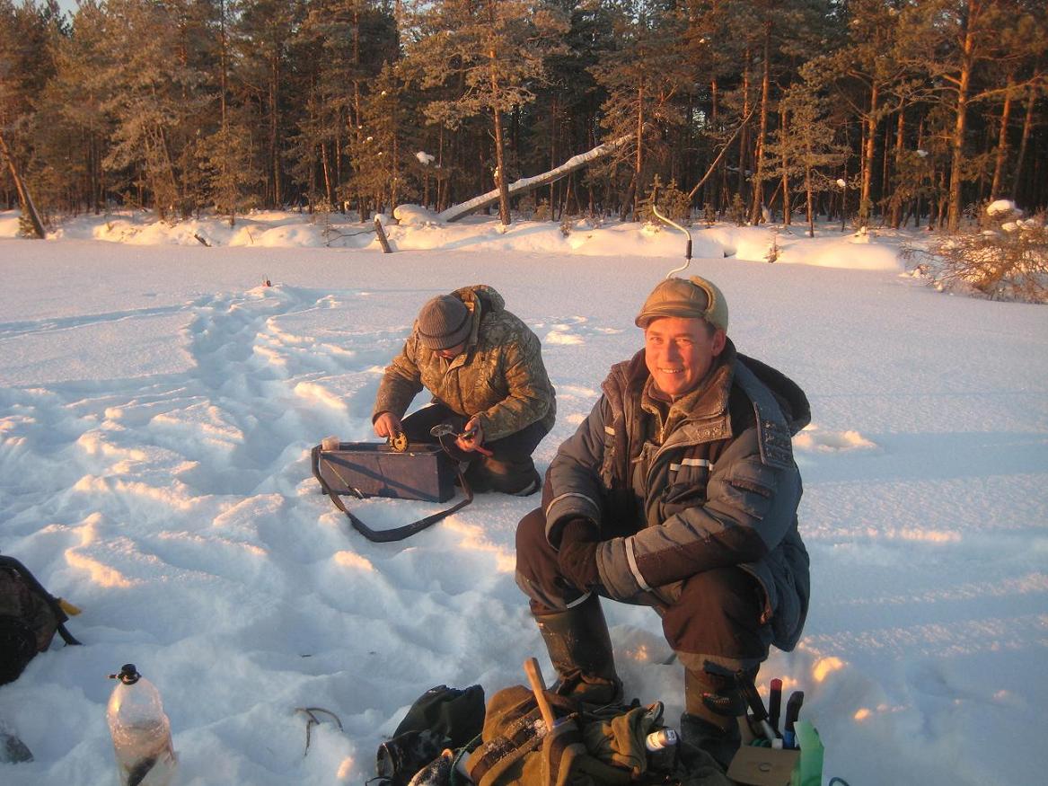 больше поклевок в этот день было. Вернулись в избушку, плотно покушали и спать. С утра еще потемну в то же место выехали. Еще в сумерках у Алексея на айсджерк взял приличный судачек.