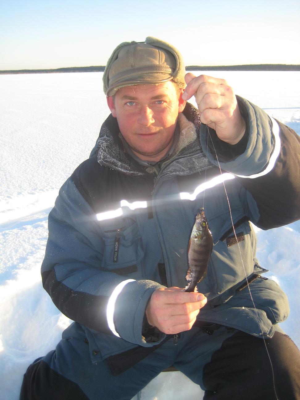 Добрались быстро и без приключений, а самое главное как раз к рассвету. И ринулись активно разбуривать перспективное место. К сожалению, как и в прошлой поездке на Чулым, лед оказался с песком, и первой пары ножей хватило лунок на 10. И ребят также. Первая поклевка случилась у Алексея. Это был вот такой замечательны окунек средних размеров.