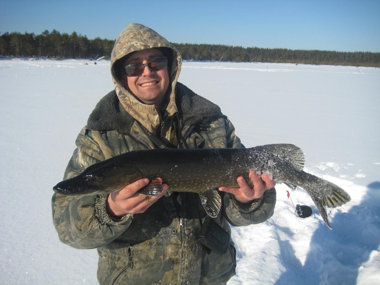 Мы с Артемом воодушевленные таким успехом бегом к ледобурам и ну превращать лед в решето. И Артем был вознагражден. Примерно через 5 минут у него случилась поклевка. Подсечка и недолгое вываживание. Была не крупной и сошла возле лунки. У Артема бур на 100. Ну капец, поехали ловить крокодилов на север)))) Ладно, сошла и поделом. В ЭТОЙ же лунки еще через минут 5 поклевка уже более солидной рыбины. Я ассистировал багориком. В итоге завели в соточную лунку щуку на 2.5 кг. Прошло не больше получаса, как в ТОЙ же лунке у Темыча села еще крупнее. Ассистировал Алексей. На вскидку около 4 кг щучка. Отлично!