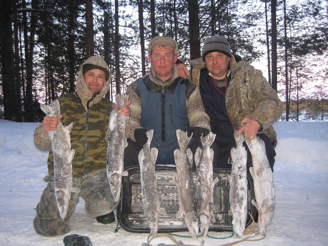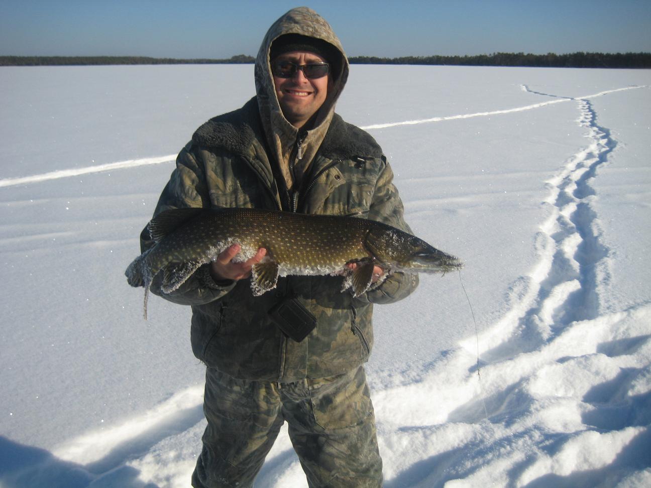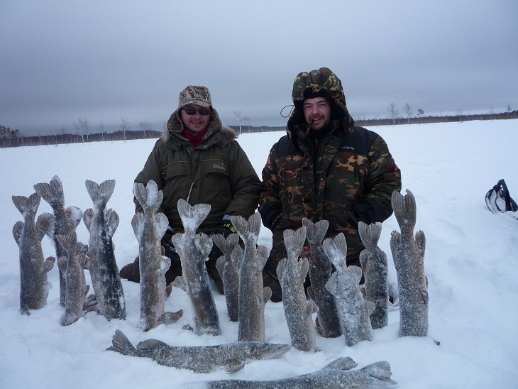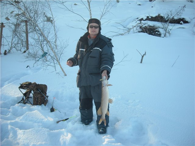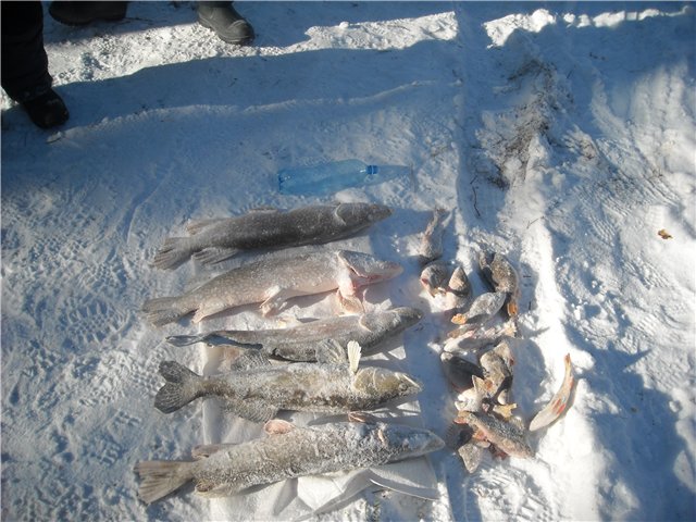 Судачек примерно на 2.5 кг. Походили помакали, поменяли приманки.... Тишина. Решаем с Артемом ехать вниз по течению искать новые места. Алексей, воодушевленный поимкой судака остается. Хорошо кататься на снежике по реке.)))Проехав 24 км, и не найдя ни одного приличного места для рыбалки, решаем возвращаться. К тому времени Алексей изловил еще одну зубастую отличного размера, и двух благополучно упустил. Первую, потому что рыбачил без поводка и монолеска 0.36 срезалась на ура, а вторую - не выдержала застежка (на которую тройник вешается) на китайском балансире. На сим наш улов закончился. Пора домой ехать. Попрощались с рекой и избушкой, фото улова