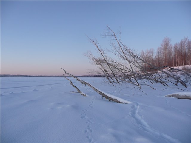 Были еще какие-то "потычки" у него, но на этом рыб отзываться в его лунке да и в соседних тоже совсем не желал. В этом же месте у меня случился обидный мощный сход: Просверлил новую лунку, начал опускать балансир и тут же зацепился за веточку, легкими подергиваниями пытался отцепить балансир. Вроде бы сошел, нет, опять что-то держит. Естественно подсечку никакую я не делал, и тут то что держало кАААк заходило....ну как заходило, так и ушло. Обидно. Больше поклевок в это обширном коряжнике не было. Около 12-ти часов принимаем решение двигаться дальше. Проехали по реке км 3-4 до нового места. Прекрасные большие деревья в воде, но глубины совсем мало, около 2-х метров. Но все таки находим окунька, поймали на одном пятачке штук 30 на троих и я с Алексеем по мелкощучке. Скучновато в такой то глуши.....Собираемся и едем в сторону дома. На выезде с реки находим еще одно не очень перспективное место - коряг мало, течение есть, но зато под яром. Решаем остановиться тут до вечера, и как потом оказалось не зря. Активно буримся, хотя силы уже на исходе, меняем ножи на бурах. Поклевок нет, совсем нет.....Слышу как у Алексея щелкает фрикцион. Вижу, как у него начинается борьба с хорошим соперником, включаю фотик в режим записи и снимаю. здесь можно посмотреть.