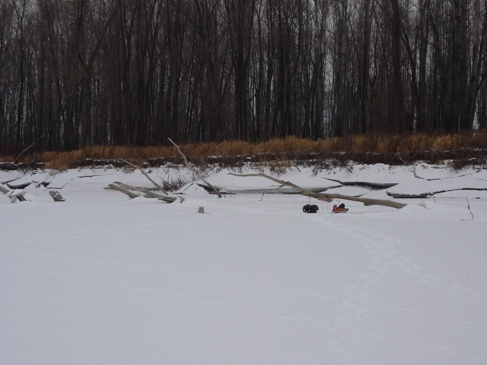 Поскольку ехать далеко уже не было времени, поехали в речпорт. Представшая нашим глазам картина удручала - сколько хватает глаз лед - сплошной торосник, бурить который по крайней мере до середины зимы нереально. Только устье протоки покрыто ровным льдом и там тусят несколько человек. Мы там пробывать не стали и вернулись на протоку поближе к деревне. Там очень быстро обнаружили, что бодро клюет меклий окушок грам по 20-30. Причем на все - мармышко, блесны разных конструкцый и балансиры. Всю пойманную рыбу кидали назад в лунки. Клев от этого не портился, несмотря на небольшую глубину. Скоро начало смеркаться, мы дополдничали :!: чего осталось и двинули домой несолоно хлебавши.
