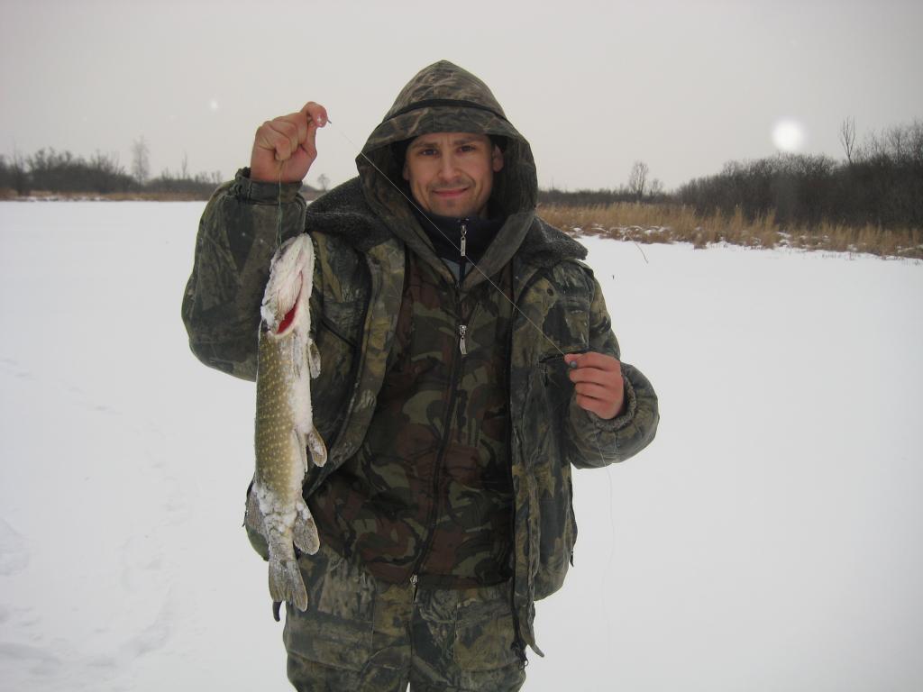 Это дало нам возможность более чем вольготно распоряжаться Означенной Окваторией и не скрывая чуйства радости орать на все озеро после каждой выловленной рыбки, а не делать тайные знаки, тут же закапывая уловы в снег :)) А рыбка скучать не давала - с самого утра обозначились уверенные поклевки, некоторые из которых даже удалось реализовать. Да и погода была просто на удивление - ни ветерка, ни снега, -8С - благодать, да и только! Мелкая щучка поклевывала практически весь день, волнами, с небольшими перерывчиками, а утром и под вечер активизировался окушок, причем совсем не скромных, не жерличных, размеров. Но тем не менее приспособили одного на жерличку, поимели пару-тройку загораний флажка, но безрезультатно... потом решили, что это не щука нападала на заряженного окуня, а окунь решил погоняться за тамошними карандашиками. Кстати, у некоторых щучек в пасти торчали хвосты ранее заглоченных жертв, и она еще и долбила по балансиру. После обеда можно было уже и запечатлиться с уловом,