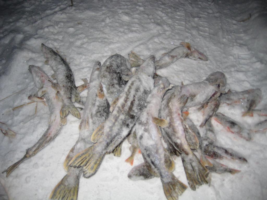и стали дырявить лед. Довольно скоро я выхватил небольшого судачка, а напарник Владимир с пятОк окуней. На этом первый день рыбалки подошел к концу. Мы установили палатку, распаковали спальники и отправились дремать ( тему ужина и рыбацких 100 гр. культурно опускаю). Утром еще затемно выдвинулись со стана к вечерним корягам. Прогулка в 1,5 километра после здорового сна оказалась довольно приятной. Володя продолжил ловить полосатых, а я опять стал искать судака. До обеда Вован поймал около трех десятков разного калибра окуней, самый зачетный из которых на вид был около 350-400 гр