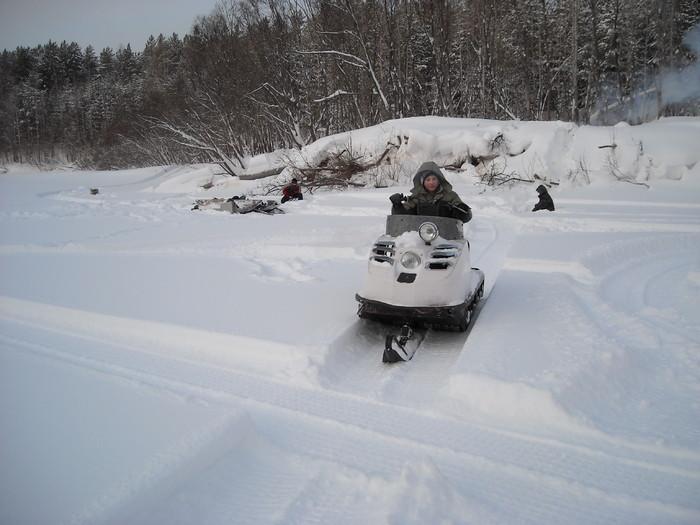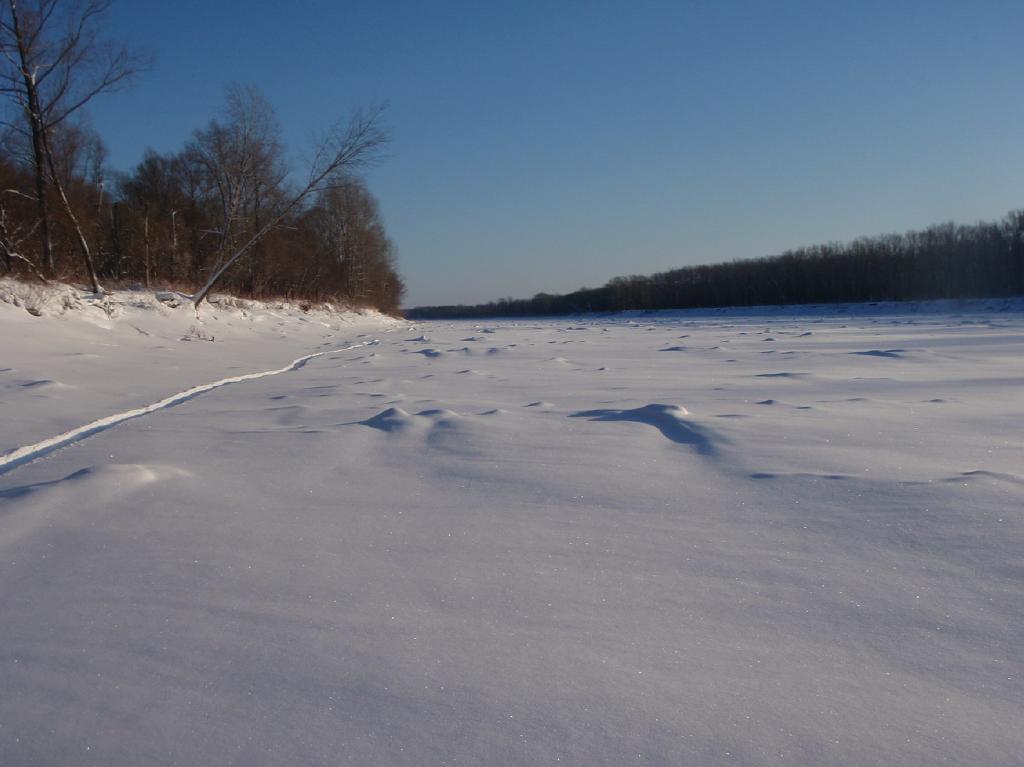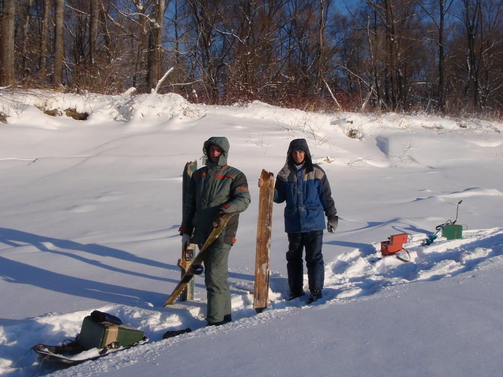 а на реке пренеприятнейший, пронизывающий до костей северовосточный бриз и совсем не зимний уровень воды. Первые километры по снежной целине дались очень нелегко. Лыжи тонули в еще никем не тронутом, не слежавшемся, глубоком пухляке. На покрытой торосами реке не было ни буранницы, ни тропинок, поэтому мы в этот раз получились первопроходцами и по очереди протаптывали лыжню, пока не добрались к заветной, примеченной еще с лета, ямке. Правда в этом месте торосник подошел вплотную к берегу, оставив нам совсем немного места для бурения... Здесь мы сумели продержаться пару безрезультатных часов, пока тот самый прохладный ветерок нас не выжил. На переходе попали в сильную наледь и остановились в хорошо защищенном от ветра месте, чтобы очистить лыжи от налипшего мокрого снега и испить чайку.
