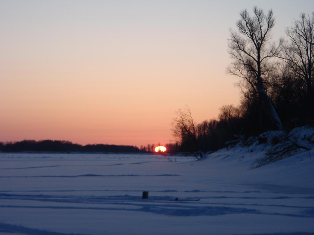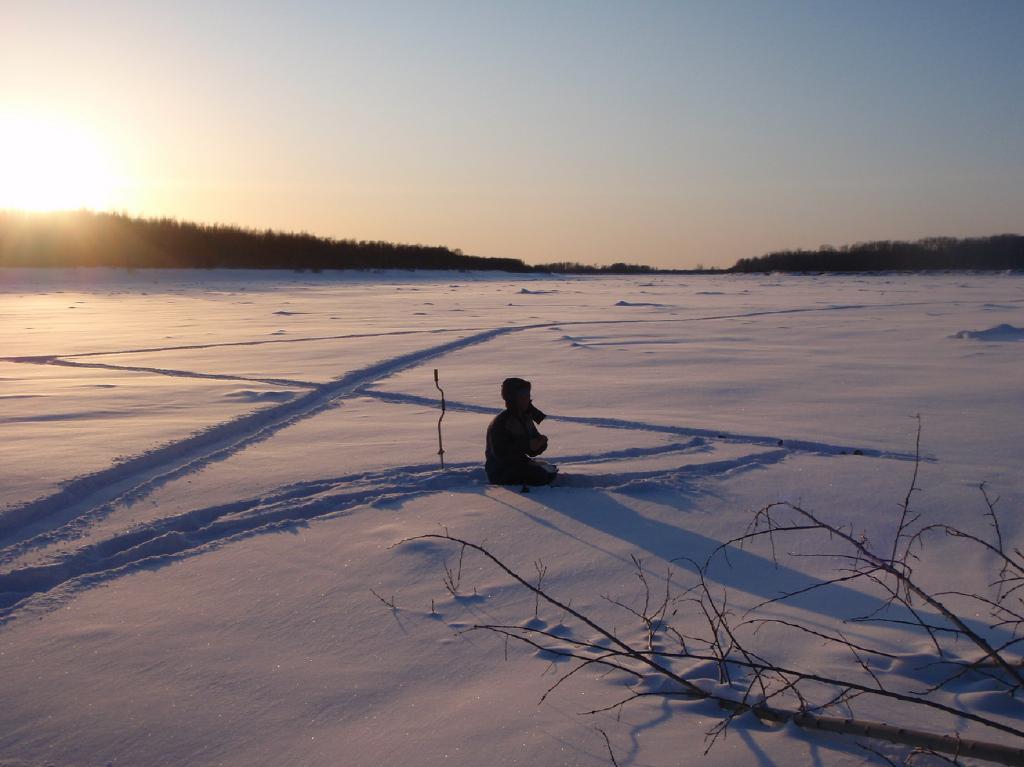 Извлекаю балансир из щучьей пасти, опускаю в ту же лунку и снова удар... на этот раз, судя по сопротивлению, попался вполне приличный окунь, но вот вытащить его не получилось - подлец сбежал, зацепившись колючками за край лунки. Вечерело... утомленное ветром и морозом солнце скатывалось за горизонт
