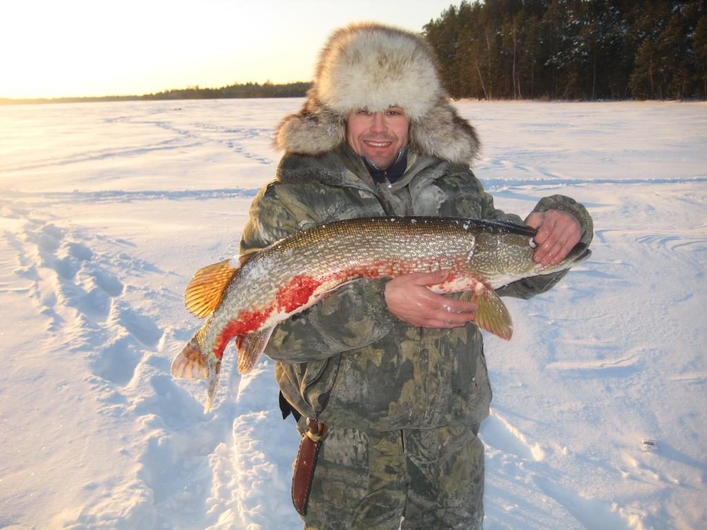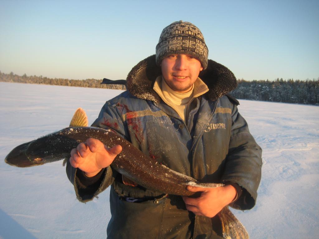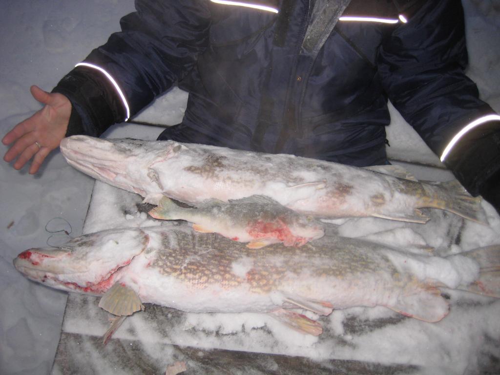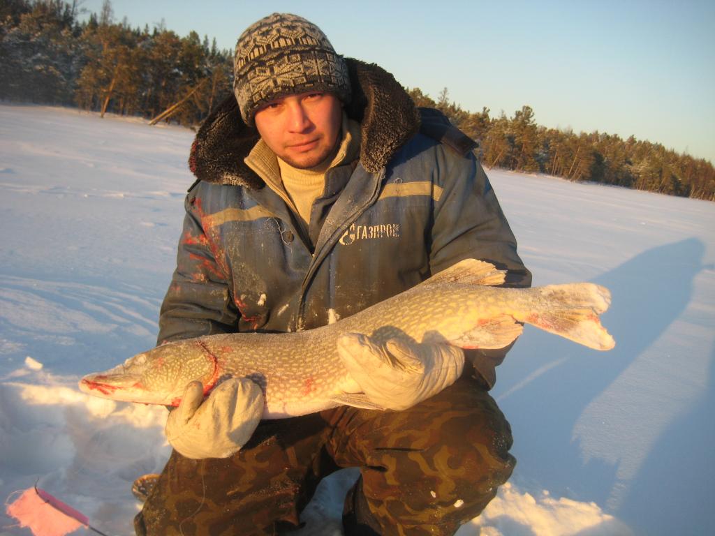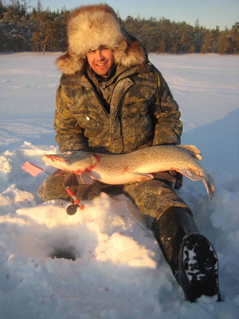 Отогревшись и отдышавшись мы переместились в другую точку, где крутой берег хоть как-то защищал от ветра, а над нами, на высоте 3-4 метра нависали обломки берегового льда, как свидетельство того самого сильнейшего осеннего паводка, после которого река до сих пор не может прийти в себя. Здесь было повеселее, хотя бы потому, что ощущались вялые, бессистемные поклевки, но они вносили хоть какое-то разнообразие, давали надежду уйти от нулевого результата и заставляли чаще менять приманки, чтобы хоть как-то простимулировать активность хищника. В очередной лунке необловленый еще балансир стукается о подводную коряжку, отлетает в сторону и в этот моменьт происходит уверенная хватка. Есть! Попалась хоть и небольшая, чуть поболее килограмма, щучка, но все-равно приятно