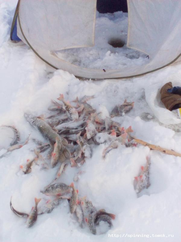 Начать решили с ловли живца и постановки жерлиц, а затем переключится на ловлю полосатого разбойника. Работали командно: совместно наловили живца, а затем Рома бурил лунки, а я с Игорем занимались постановкой. Процесс усложнялся из – за большого снежного покрова который скрывал под собой наледь и постоянно идущего снега, но благодаря сплочённой работе все получилось). После постановки всех жерлиц, просим таёжного бога, наградить нас за труды и рвем кокти на соседнее озеро, отрываться по окуню. Путик до озера пролегал по старому каналу (прорытый еще в 80 года, рыб. хозом), который соединял два озера, и являлся самым коротким путем. Часть канала проходит через хвойный массив, а часть по болоту. На дорогу ушло около 40 минут, в течении которых мы любовались природными красотами. Как только прибыли на место, сразу приступили к процессу ловли. Окунь ловился наплывами, то 3 с лунки то 15, короче бурили много. Основной окунь от 150 до 300 грамм, но попадались и хорошие экземпляры. Я в основном ловил на мормышку с мотылем, и в моменты выключения клева переходил на столбик или балансир, Рома с Игорем предпочитали столбик и безмотылки с подсадкой пикуля.