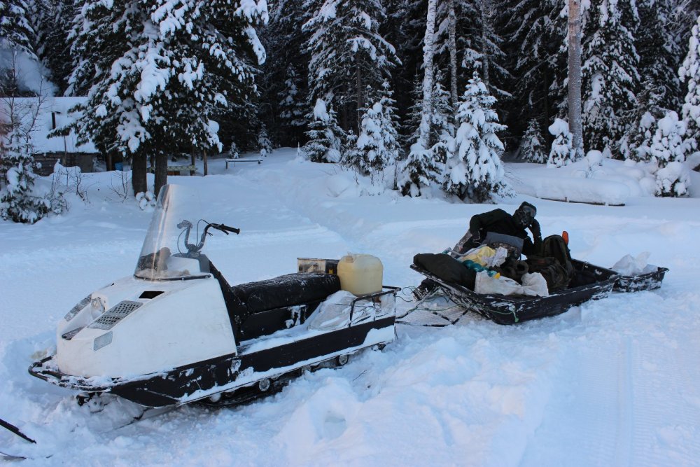 Зимой в тайге темнота приходит быстро, поэтому в 15-30 стартуем проверять жерлицы. Двигаясь по каналу в узком месте среди зарослей ельника и кустов заваливаемся в пухляк и снегоход зарывается, хорошо за нами ехали местные мужики, которые выходили последними. Если не они, копались бы мы там до утра). Большое спасибо им. Прибыв к месту постановки жерлиц, увидели нехорошую картину, из – за теплой погоды и идущего второй день снега, давануло воду. Приходилось передвигаться по вводно – снежной каше, которая была местами выше колена. После проверки большей части жерлиц, результат был нулевой. Осталось проверить всего 3. В мыслях трепыхается надежда, что шанс еще есть. И вот проверяем первую из трех, что то есть, начинаем выводить, бах сход, эмоции хлещут через край. Успокаиваемся, проверяем вторую, и опять удачно, аккуратно вывожу, стараясь победить мондраж, и вот первая мамка 2017 года на льду, ликованию нет предела, на взгляд 4 – 5 кг.