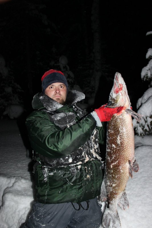 Уже стемнело, все мокрые, но радостные фотографируемся с мамулей, но осталась одна жерлица, Игорь пошел снимать ее один, и вдруг из темноты раздался его голос: мужики, что то есть. Откуда взялись силы, я не знаю, но рванули мы к нему как молодые жеребцы. Подбегаем к лунке, Игорь отдает шнур в руки Роме, со словами выводи, новичкам везет. На том конце было, что то крупное, так как рому постоянно притягивало к лунки, но он не сдавался. После того как он ее немного подтянул к поверхности, шнур заклинился. Игорь предположил, что или замоталась за корягу или не влезает в лунку. После того как шнур начал стравливаться, а присутствие рыбы проявлялось рывками, принимаем решение, расширять лунку пешней. После 10 минут работы, начинаем пробовать выводить, и вот из ледяной шуги показывается огромная голова, а затем тело, которое застревает в лунке на половине, щука начинает трепыхаться и пытается вернуться обратно в свою стихию. Но от Ромы не уйдешь, он как дикий хищник, навалился в сем телом на нее и вытащил громадину на лед. Тишину ночной тайги нарушил дикий ор ликующих рыбаков. Она была прекрасна, с красно бурым окрасом. Быстро фотаемся, и уже по полной темноте устремляемся на заимку.