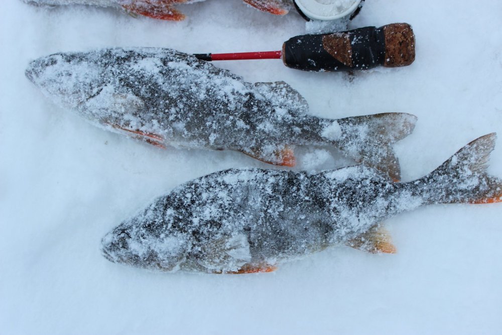 Пробудился я от звука скворчащей сковородки сопровождающий вкусными ароматами, это Игорь уже готовил завтрак. Быстро собираемся, завтракаем и выдвигаемся к точке лова. План на день был таков: До 16 – 00 ловим окуня, на вчерашнем месте, а затем едим проверять жерлицы. Температура была комфортной (-3 С), но снег не прекращался уже второй день. Клев был чуть получше, размерность как вчера. Кроме нас было еще три группы рыбаков ( всего человек 15), которые растворились на огромной территории озера.