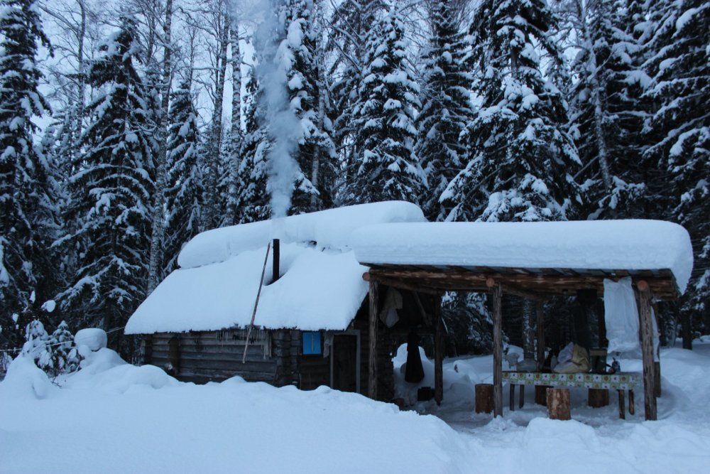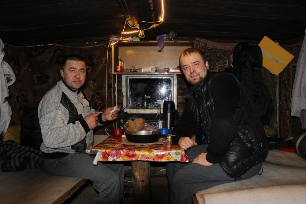 Время на рыбалке летит быстро, и вот уже сумерки, надо выдвигаться к избушке. Проехав примерно метров 500, усталость и куча бурных эмоций убаюкала нас прямо в санях, когда открыл глаза мы уже подъехали к избе. Сразу занялись бытовыми делами (топка печки, сушка амуниция, приготовление ужина). Во время ужина делимся впечатлениями и набрасываем план на завтра. Но накопившаяся усталость как строгая няня, сказала спать.