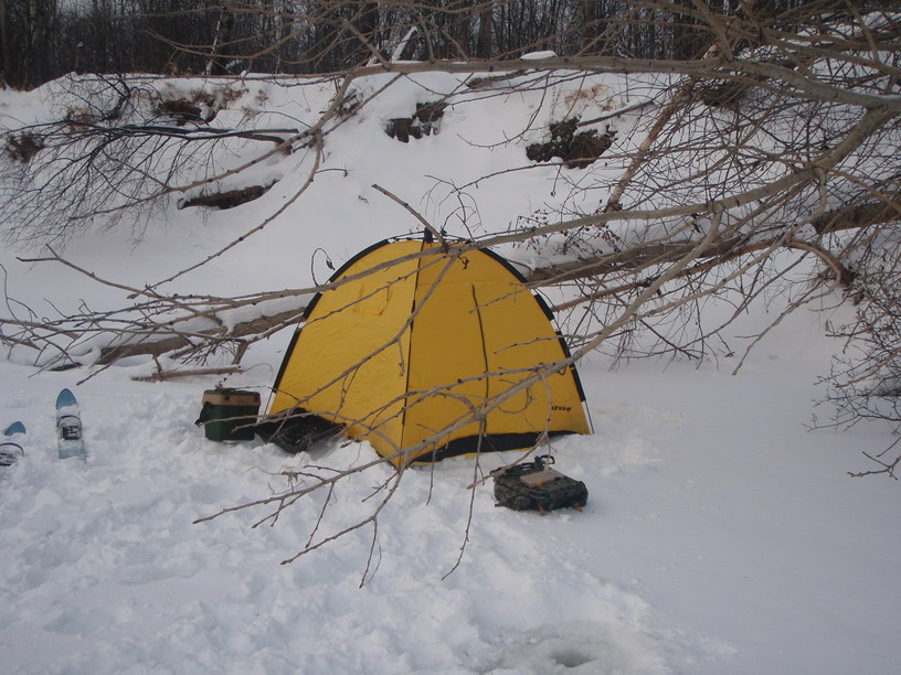 Решительный лыже-санный марш-бросок по речной целине - и мы на точке. Первым делом организовали базовый лагерь, разбив новоприобретеную суперавтоматическую чудо-палатку