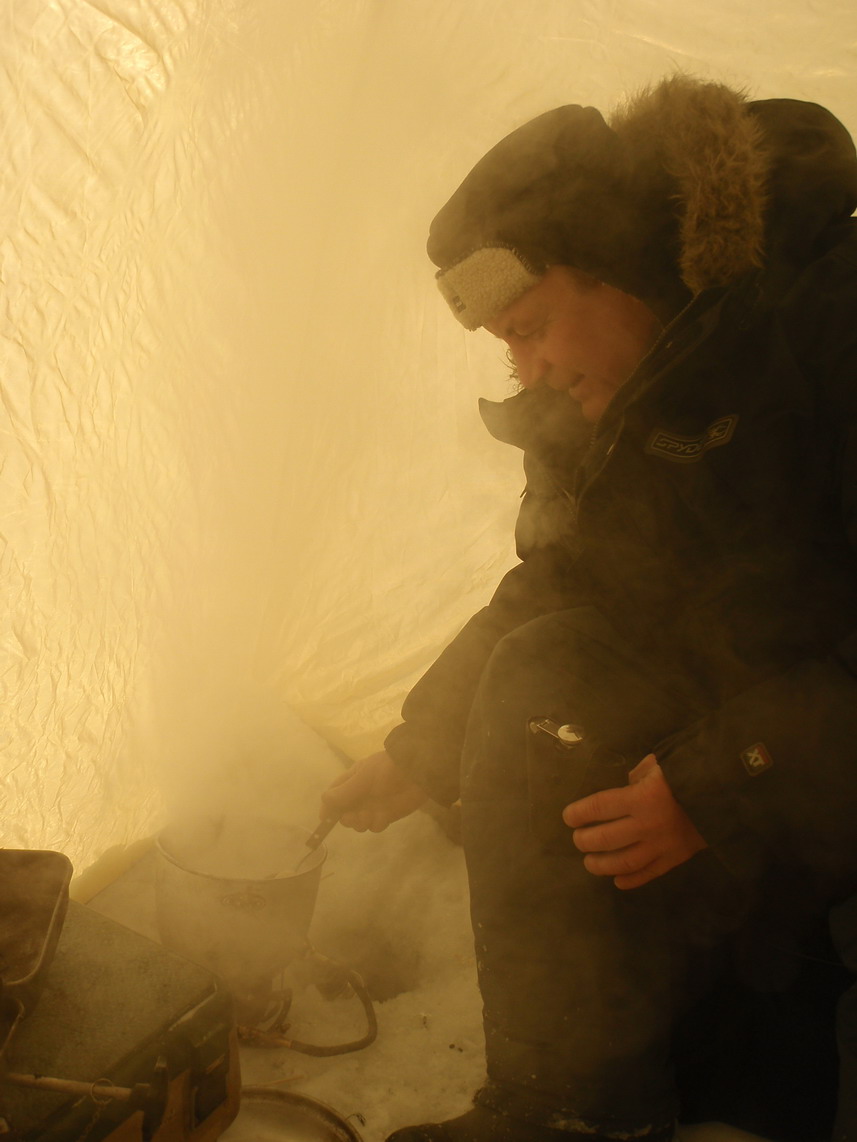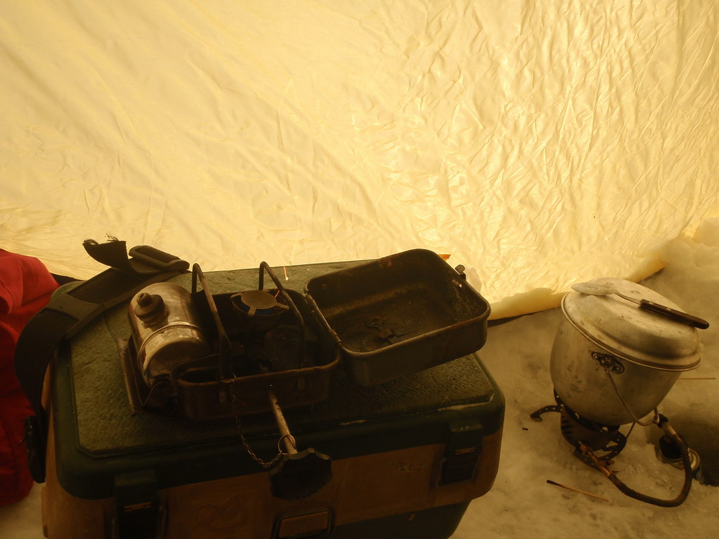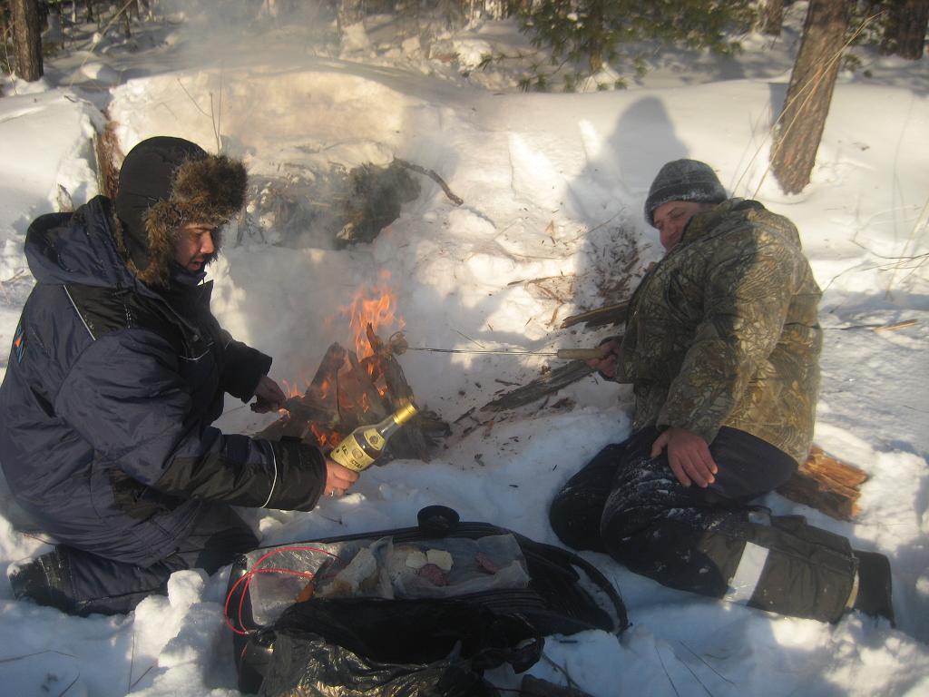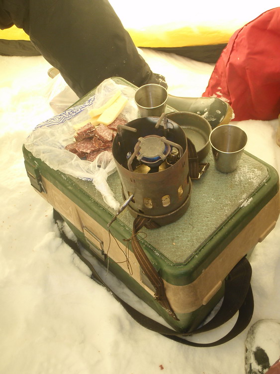 Погодка, конечно, не жаловала, но минус 24С это все же не минус 35С, поэтому было веселее, чем, например, в прошлые выходные... А вот рыбка, похоже, сезончик-то уже завершила... Ближе к обеду предварительный обход участников заезда выявил следующие результаты - у меня ноль поклевок и ноль выловленых хвостов, у Кузьмича было замечено неоднократное вялое качание кивка, но без каких-либо последствий для ихтиофауны, и только Миша показал стопроцентный результат - одна поклевка и один пойманный окунь, который был тут же спрятан в коробочку для балансиров. Оставив победителя промежуточного финиша улучшать показатели, мы с Кузьмичем приступили к подготовке горячего праздничного обеда. Первым делом я распалил старенький спецназовский примус. Громко шипя и извергая синее пламя он наполнял палатку живительным теплом