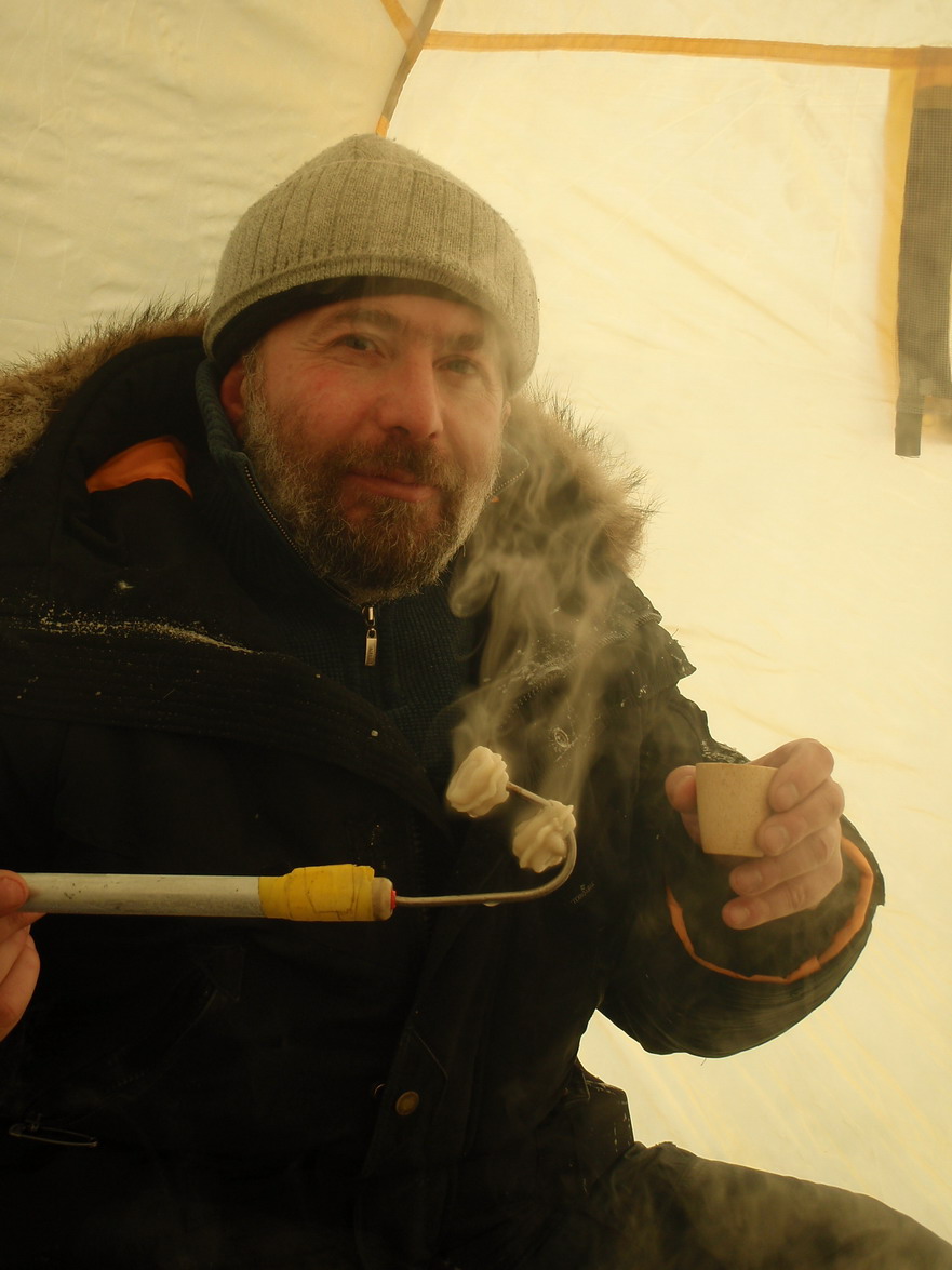 на туман и запах из палатки, прибился к нам и Михаил... с гордостью сообщив, что он имел еще целых три, правда ни разу не реализованных, поклевки... чем, конечно же, серьезно ухудшил свои показатели... Кроме того выяснилось, что Миша оказался самым недоверчивым из нас, а именно - не веря, что Кузьмичу удастся изварить пельмени в таких экстремальных условиях, он даже не запасся ложечкой для поедания оных
