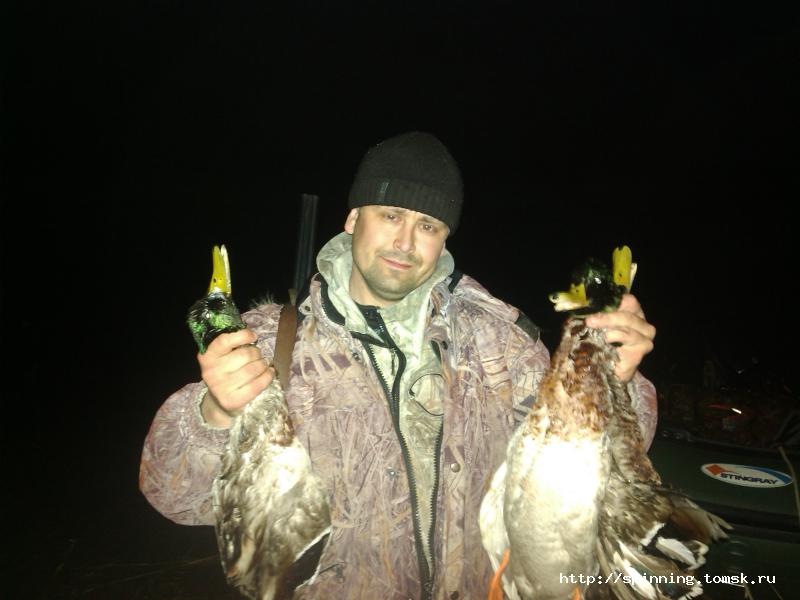 Готовимся на вечерку, собрали сеть маскировочную заранее. рано вечером не поехали, что там делать, по вчерашнему принципу, утка летит когда солнышко садиться. Натаскали дровишек в баньку, воды, чтобы к нашему возвращению все было готово. Дождались вечера, упали в лодку и в путь. Уток расставил, сеть натянули и совсем другой эффект. Сидим ждем, но вот что то сегодня вечером наши курицы не крякают, вот не задача, утка вроде летает и селезни садятся, плавают на другой стороне гогочат по своему, а не плывут, как только утка отзовется, они по другой стороне краем на другую сторону, пуганные видимо стали, поняли в чем загвоздка, либо уже все на влюблялись, что больше не хотят. Уже стемнело, один все плавал, плавал, к берегу подплыл и пропал, сидим с Сережкой ведем рассуждения, подумываем, почему так вечером плохо утка отработала, да что все надо собираться, тут гляжу м/у кочек уже поближе силует появился и вроде головой крутит, решили стрельнуть на удачу, навожу ствол, выстрел, никто не взлетел, тут Серега через сек 5 повторно шмальнул.