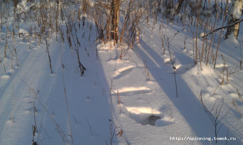 Решаем подходить. Но в этом мире все постоянно и все повторяется с точностью до мелочей. Подход завершается неудачно, но по дороге мы находим поляну с лунками и понимаем почему они так рано остались без своих хозяев. Рыжая плутовка нашла лунки и решив закусить тетеревятинкой подняла птиц. В некоторых местах снег разрыт на метр. Следов лисы очень много, видно как она прыгала на лунки и пыталась выкопать себе птичку. Но по отсутствию перьев и крови понимаем, что ее замысел видимо не удался.