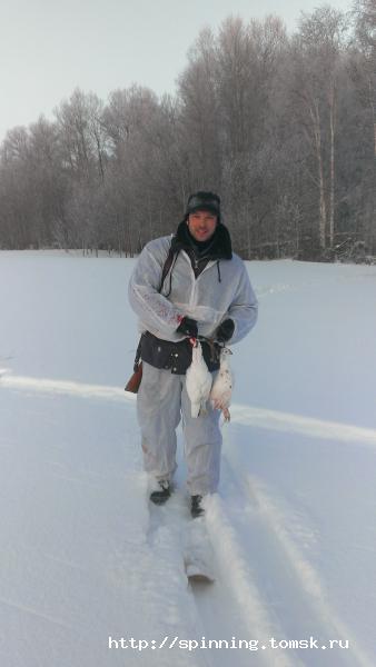 не поехал сославшись на дела в городе) идем по кромке лесного массива, а двое других идут через этот массив. И вот хлопанье крыльев справа, вылетают 3 куропатки, раздаются выстрелы, но далеко. Все мимо. Заметив куда они перелетели продолжаем преследование. Разделившись обходим рощицы берез в поисках дичи. И вот они, вылетают со стороны в которой шли парни. Далековато от меня но я решаю стрелять. Первый, пошла 5-ка бесконтейнерная.... мимо! Второй выстрел-3-ка контейнер. Есть попадание! Но только зацепил. Куропатка описываю круги на одном месте видимо ранена очень легко. Но вот она падает в снег и ныряет с его спасительную глубину. Перезаряжаюсь и иду к месту падения. Собран до предела, ружье в руках наготове. Подхожу, сидит голубушка в снегу, расстояние метр. Решаю просто поймать. Наступаю на нее лыжей и хватаю руками. Знаю же что нужно за голову, но почему-то пытаюсь за хвост. Птица с испуганным клекотом вылетает из под лыжи, перчатки соскальзывают и она летит проч. Я подскальзываюсь на лыжах и падаю в сугроб. Сзади раздаются выстрелы. Но все мимо. Я из положения лёжа на боку в сугробе стреляю и мажу, прицеливаюсь второй раз и сбиваю птицу. Ура! Есть добыча.