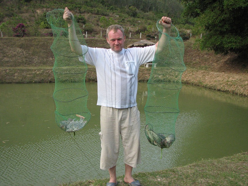 А здесь друг Виктор (пескарь) демонстрирует двухчасовой китайский улов. В одном садке пираньи, в другом какая-то местная рыба с непроизносимым названием.
