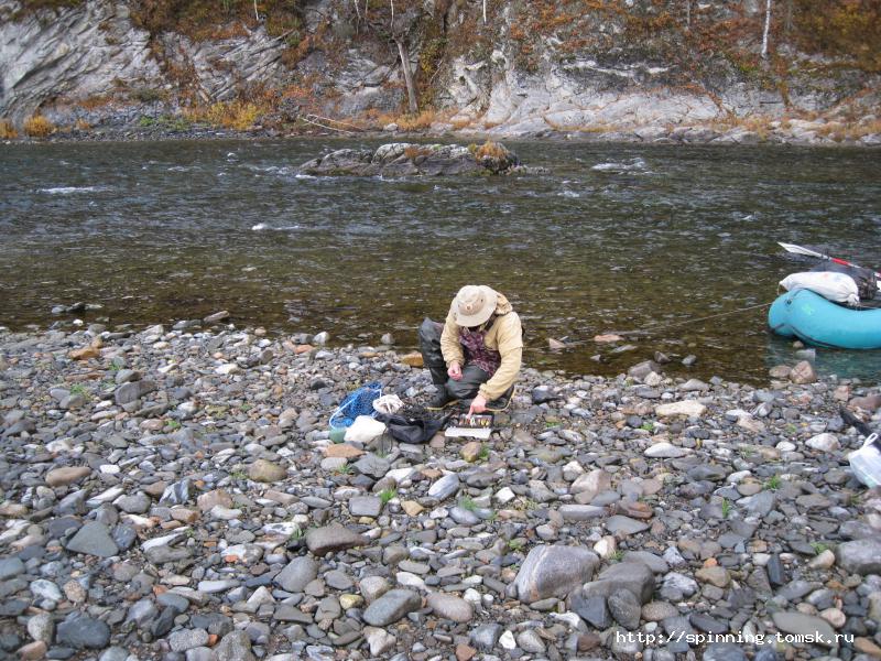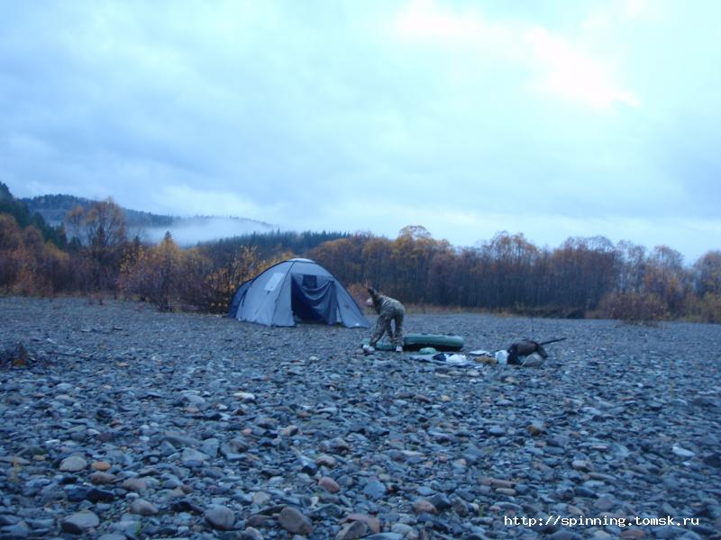 Быстрыми, натренированными движениями ставим палатку и скорее на перекат, уж тут-то действительно повезет, не может не повезти. Прокидали перекат раз... другой... третий... тишина... пусто... обидно... Переходим на плес, долго бредем по мелководью, занимаем позиции на больших валунах... тишина
