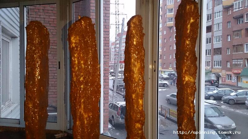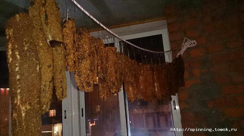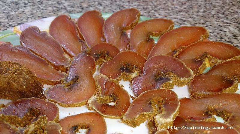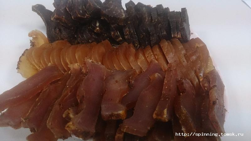 Далее напишу способ, к которому я в итоге пришел. После того, как обсушили, обваливаем мясо в емкости со специями тщательно со всех сторон, без пропусков. Специи - кто какие любит, у меня это сушеный чеснок, много сладкого перца (паприка), смесь перцев (фирма цикория), молотый кориандр, жгучий красный перец, молотая зира (только не много, а то будет горчить), молотый тмин. Вообще, если окунуть кончик пальца в специи, попробовать и будет вкусно, значит нормально ))). Вывешиваем филешки в прохладное проветриваемое место, причем: чем более проветриваемое, тем менее прохладное оно может быть, и на оборот, чем менее проветриваемое, тем более прохладное. Я это делал поздней осенью, начало зимы, вывешивал на балкон. Рамы там не сильно герметичные, иногда специально оставлял чуть приоткрытыми, что бы было движение воздуха. Это время хорошо тем, что нет насекомых, иначе мясо нужно заворачивать в чистую х/б ткань и заматывать ниткой. Я начинаю пробовать через недели 1,5 – 2. Тут уж кому какое нравиться. Сначала оно не сильно сухое, корочка подсушена а внутри типа плотного мармелада. Потом, недели через 3-4 оно более сухое, вкус более насыщенный. Мне нравится на всех этапах ))). По вкусу мне больше всего нравится говядина, некоторым курица, свинина тоже вкусная.