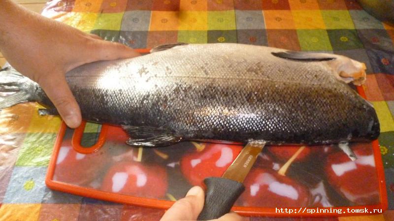 Размороженную рыбу (по-хорошему, она должна быть не замороженная, а охлажденная) разрезаем вдоль хребта, разрезая кости.