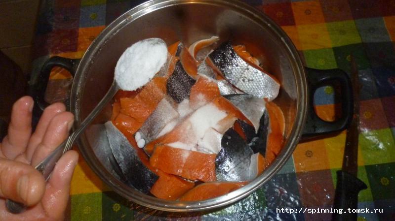 Я сначала скидал рыбу и насыпал "на глаз" соли: