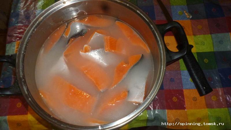 В подходящую емкость замешиваем крутой раствор соли (очищенная картошка всплывает), закидываем рыбу.