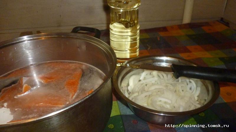 Пока рыбка просаливается, режем репчатый лучок и готовим рафинированное масло (любое)