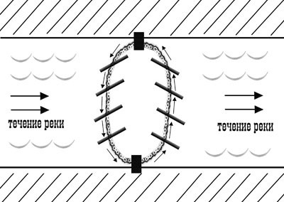 Видимо, это древнее, как мир, устройство натолкнуло алтайского самоучку Николая Ленёва на идею бесплотинной электростанции. Точно так же под углом 45° к течению реки он разместил дощечки. Соединил их велосипедной цепью - получился замкнутый контур, вращаемый набегающим потоком. Раму с цепью установил на поплавках, которые крепятся к якорям или берегам. Осталось передать вращение на электрогенератор.