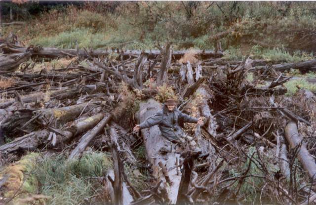 Вот вам и пожалте: дождь, под дождем завал. На завале Серега, а под завалом река. Это средний такой завал - метров тридцать-пятьдесят длиной. Бывали и больше, бывали и меньше. Судя по характеру древесины, он тут не первый год лежит. А на одном завале - он длиной метров за 200 - вырос лес в два роста. Он так и называется - "Рослый лес". Технология преодоления завала незамысловата и угрюма, как сама жизнь. Выгружаешься на берег, при помощи топора и ножей бьешь тропу шириной в метр через черемуху и краснотал, затем в три ходки (Господи! ну откуда столько барахла!) перетаскиваешь вещи, укладываешься и плывешь себе спокойненько дальше. До следующего поворота. Там начинаешь все сначала. Всего завалов, именно тех, которые обходили по берегу, было больше 20. Мелочь, которую брали сходу, а мы здорово наловчились это делать, просто не считали.