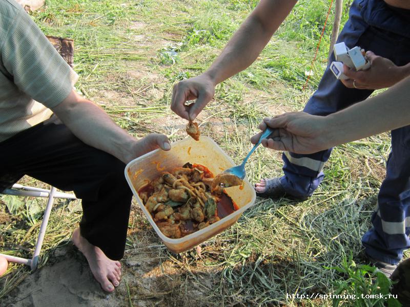 Время неумолимо приближалось к обеду, нужно было двигаться на стан. Прибыв, обсудили наши рыболовные успехи. У Володи на вертушки позарились щучка и язь. Он их отправил в родную стихию. Экипаж Жени с Лёней привезли щучку и пару окуней. Я занялась приготовлением обеда, а Женя начал готовить к ужину своё фирменное хе.