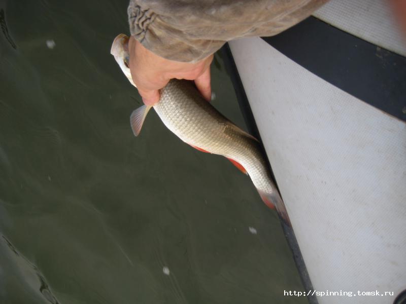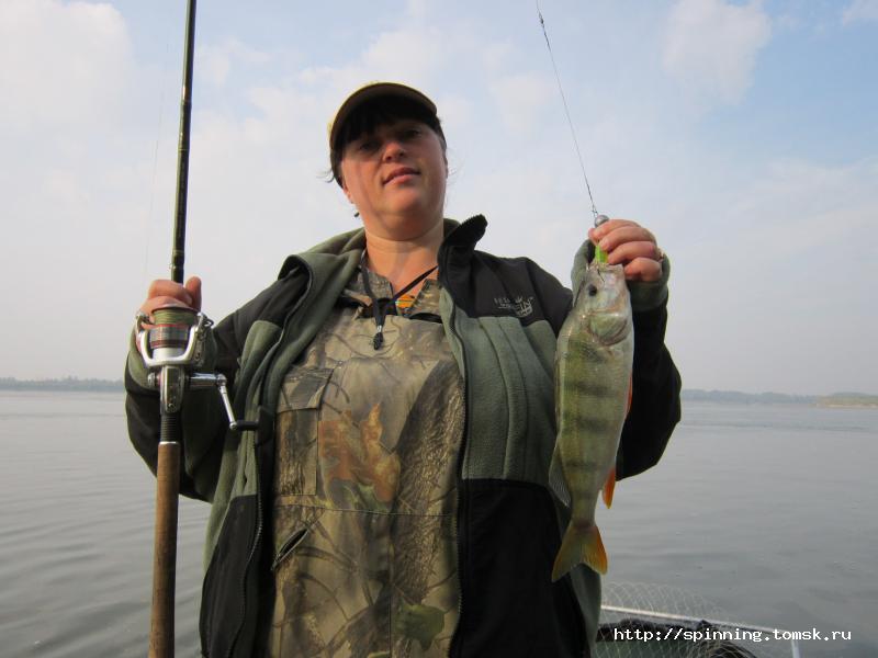С утра планы были рыбачить до 12-ти и собираться домой. Поэтому далеко не расходимся. Мы встаём на старое окунёвое место. Джиги полетели в воду. Но не клюёт. Тут я довела приманку до лодки и пару раз стукнула об дно, чтоб убедиться, добивает тут или мне показалось, всё-таки течение приличное. В этот момент резкая поклёвка и щучка, примерно в районе двушки, виснет на крючке. Несколько оборотов катушки и она уже наверху. Увидев нас, она резко мотанула головой и выплюнула приманку. Видно, не ожидая поклёвки, я просто не подсекла как надо. Расстроилась конечно, но что делать... Пробую опять постучать в отвес. Вскоре садится окунь. Его благополучно доставляю в лодку.