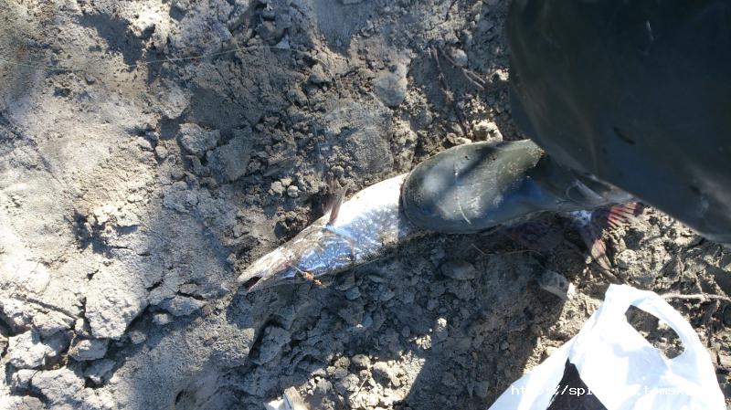 Поднял спин к верху и за плетню вытащил на берег, но мне повезло, потому что взяла она блесенку совсем не глубоко (доставая на берег могла сорваться, но об этом чуть ниже)