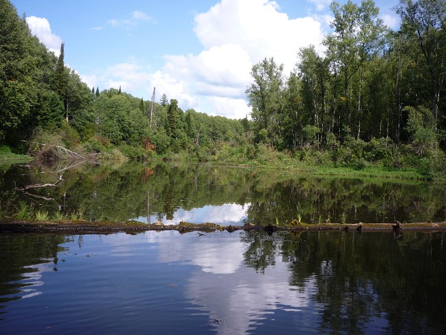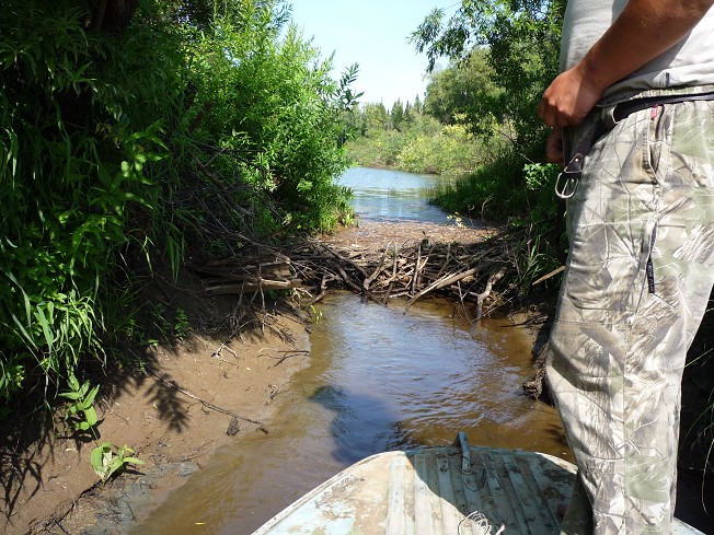Мы продолжали спускаться вниз по течению, останавливаясь на перспективных местах. Алексей говорил о хорошей курье, куда собирался зайти. Однако, на входе нас встретила плотина, сделанная бобриками.