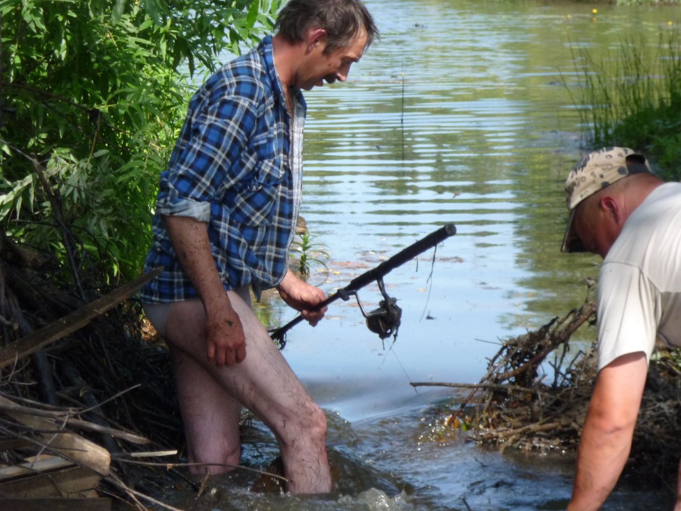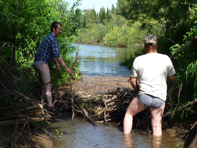 Перепад воды в реке и в курье был более полуметра! Лёша в очередной раз помянул бобров добрым словом и плотину было решено разобрать. По рассказам Алексея, таких плотин за одну поездку он бывало по несколько штук разбирал. Вобщем от этих бобров на реке одни гадости! :lol: Быстренько скинув с себя верхнюю одежду, Саша и Лёша приступили к сносу этого гидро-сооружения.