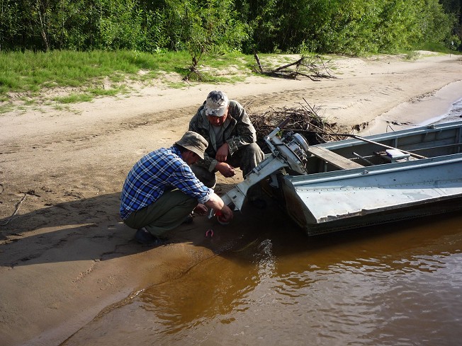 Такая рыбалка начинает просто бесить. Возвращаюсь на стан, перекусываю, открываю карту и упорно думаю: Пока сидел, приехал хозяин покоса. Показал ему джерков - реакция стандартная: (про акул). Мужик подбросил пару мыслей, где поискать крупняк. Недолго думая сгребаюсь в лодку и пру в желанное место:. Отъехал буквально километр вверх от стана (до места около 15ти км) и наскочил на косу: До этого наскакивали то здесь то там, но теперь винт мне этого не простил и на нем провернулся демпфер (резинка между винтом и втулкой): На малых оборотах едет, чуть газанешь - мотор орёт и не едет. Пока сплавлялся до стана - продолжал подергивать килушек из любого подходящего места.
