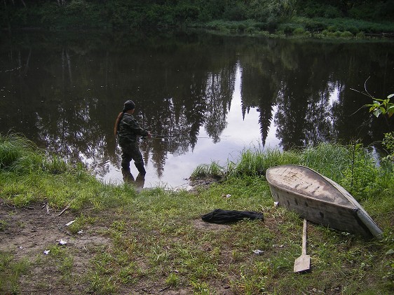 Остановились у ближайших песчаных кос, внедрившись в бурный щучий ужин. Борясь с текущей по венам горящей водой и балансируя на носу обянки с джерковой палкой в руках, я в течение 5 минут ловлю на уху 4х килушек. Пробую ловить дальше: но надвигающиеся сумерки, а также трудности с удержанием взгляда в одной точке (не ну 6 лет не виделись, по сибирски прилепили), приводят к калечению следующих пойманых щук (при освобождении от жадно заглатываемых крючков первого попавшегося джерка) которых хотел отпустить. Решено возвращатся на стан: на уху есть, первые щуки найдены без каких либо раздумий. Первый шок моего родственника от увиденных джерков сглажен жадностью килушек.