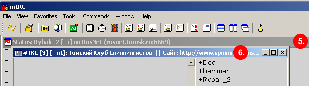 3.Как использовать:Смотрим в правый верхний угол программы и видим там список ников (7) (народ, который в данное время сидит на канале). А также видим список каналов, на которых вы сидите (8). RusNet -- это служебный канал сервера. #ТКС -- наш канал, где будем общаться )).
