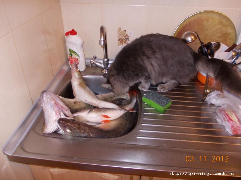 Дома кот провел ревизию результатов рыбалки и остался доволен!.